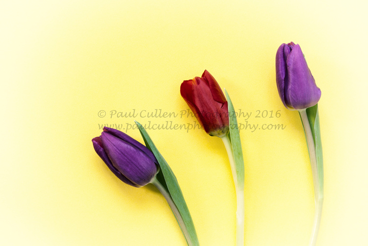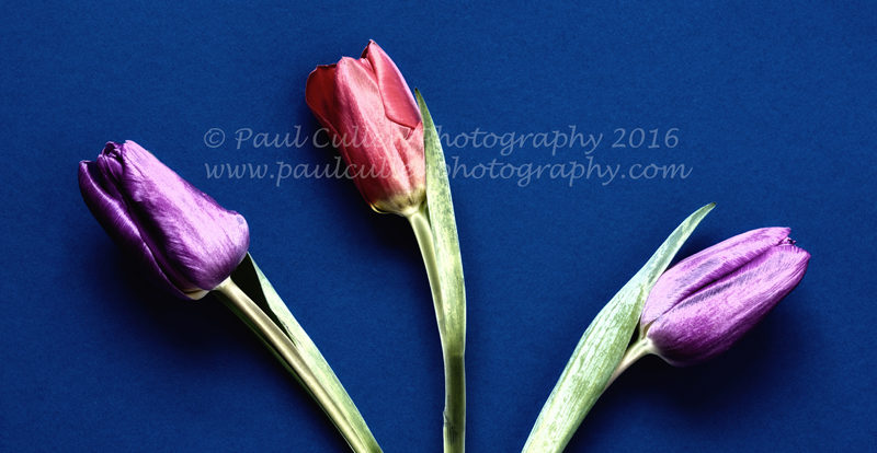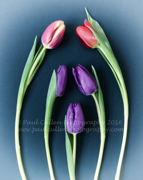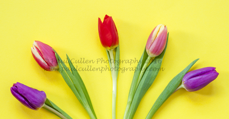 I am going through a bit of a floral phase at the moment. Not long after my fun with Lilies, Sunflowers and Gerbera came a couple of shoots with Tulips. These ones were labeled “Rainbow Tulips”, presumably as they were in many different colours. Now you could be thinking that I have an arrangement with a high-class florist but you would be wrong, these ones came from ASDA (for any American readers – Walmart own ASDA). On this occasion (the first of two) I decided to arrange them in a variety of patterns with a variety of backgrounds – I have a selection of A2 card in different colours. I used natural light with reflectors, indeed the sun was quite bright in my little studio so I had to make judicious use of the blinds to prevent harsh shadows. Camera on a sturdy tripod, lock up the mirror and slow exposures at between f11 and f16 – well the flowers were not going anywhere!. Enjoy…..